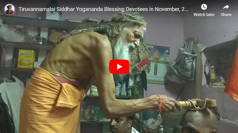 | Tiruvannamalai Siddhar Swami Yogananda Blessing Devotees in 2017 This is a video of Swami Yogananda blessing us in 2017 about a year before he entered samadhi. He had become very thin compared to prior times I had visited him. He was over 95 years old. He lived in a small hut on the Arunachala Hill, which was previously made for Ramana Maharshi's mother to stay in. In olden days, Ramana Maharshi was staying in the nearby Virupaksha cave and his mother wanted to be near to him, so devotees made this hut for her to live in. Around the time of this video, Swami Yogananda kept telling us that he was leaving soon, and that he had been given some information that his time was over. Still we took it for granted and thought he would be around for a long time. Any time we came to Tiruvannamalai he would let us stay in his tiny 1 room hut. Usually we were too many people, so some of us would sleep outside around his hut. The month before entering samadhi he called one of his followers and gave him instructions for how to make his samadhi, what type of shivalinga to keep in it, and how to carry out the worship there. His samadhi is located next to Yama Linga on the girivalam route.  | |